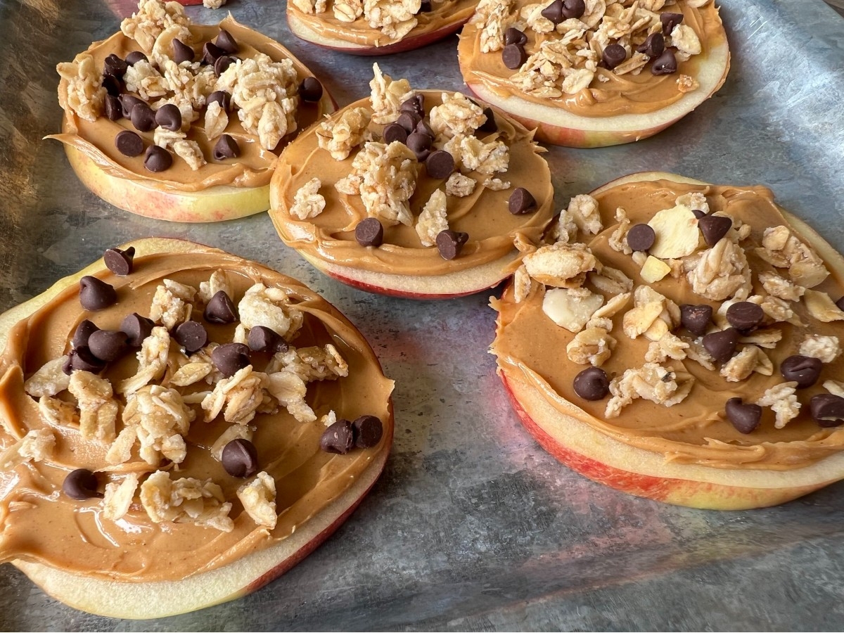 - Apple "pizzas": core and thinly slice whole apples to create circular disks, then top with peanut butter, Nutella, or your preferred topping and add a few chocolate chips