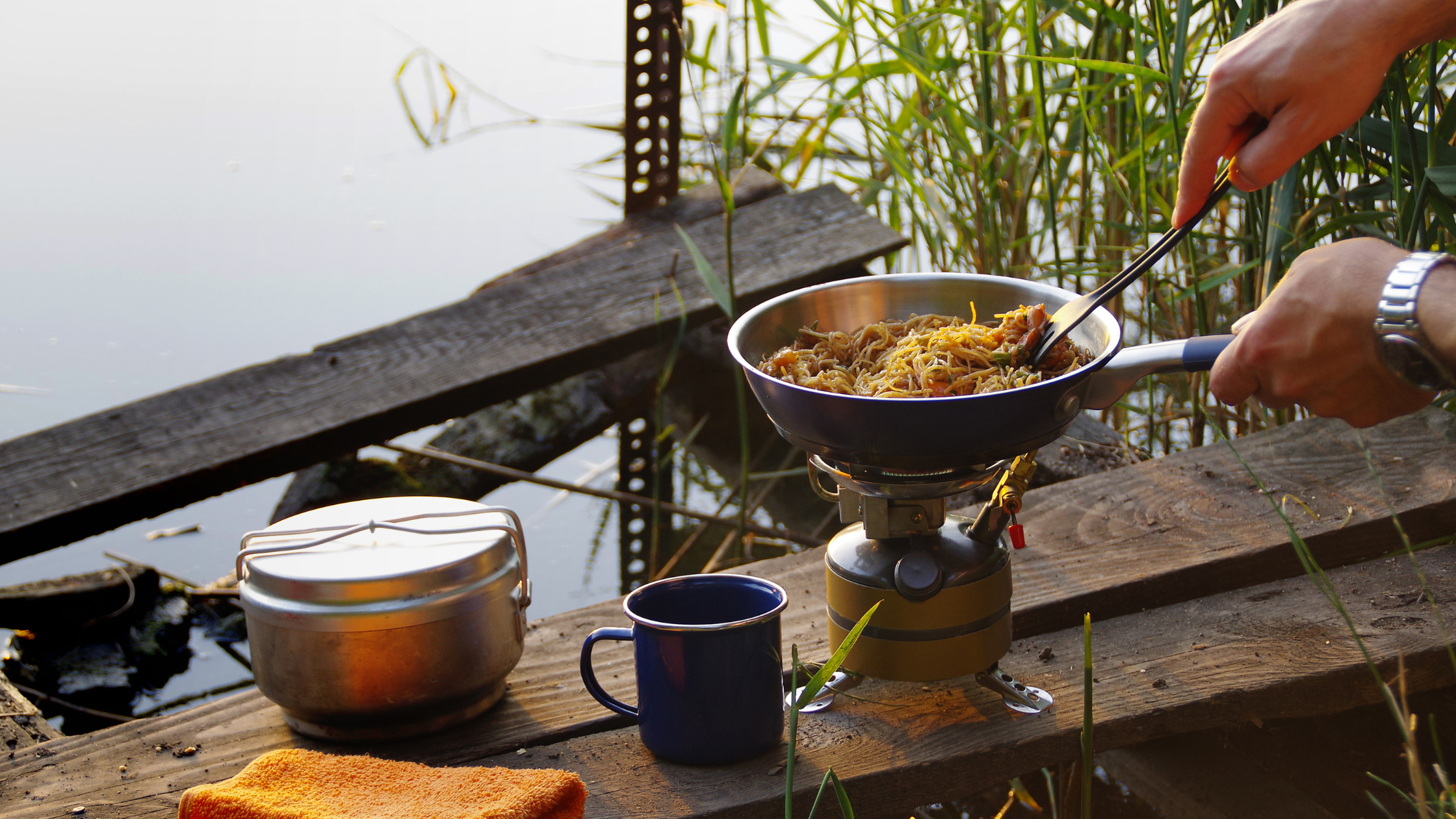 - In a large skillet over the campfire or stove, heat olive oil.